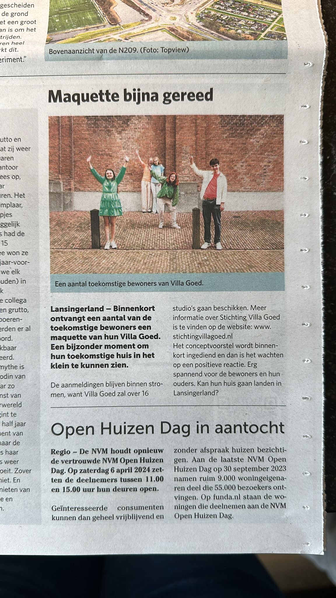 Batenburg en VanEs Architecten zetten zich met volle overgave in om dit mooie gewilde en sociale project mogelijk te maken. Vol trots hebben enkele van de toekomstige bewoners in het gemeentehuis een foto gemaakt met de maquette van hun toekomstige thuis. Stichting Villa Goed is een initiatief van de ouders van enkele van de toekomstige bewoners. De ouders hebben de stichting opgericht en werken momenteel de gehele organisatie van en rondom Villa Goed uit, zodat het huis ook als een echt thuis én met de juiste zorg functioneert. Het conceptvoorstel is officieel via het omgevingsloket ingediend en nu is het wachten op een goed vervolg! De toekomstige bewoners hopen natuurlijk op een positief antwoord en roepen de inwoners en het bestuur van onze gemeente Lansingerland op dit met elkaar mogelijk te maken. Duimt u met de bewoners mee?